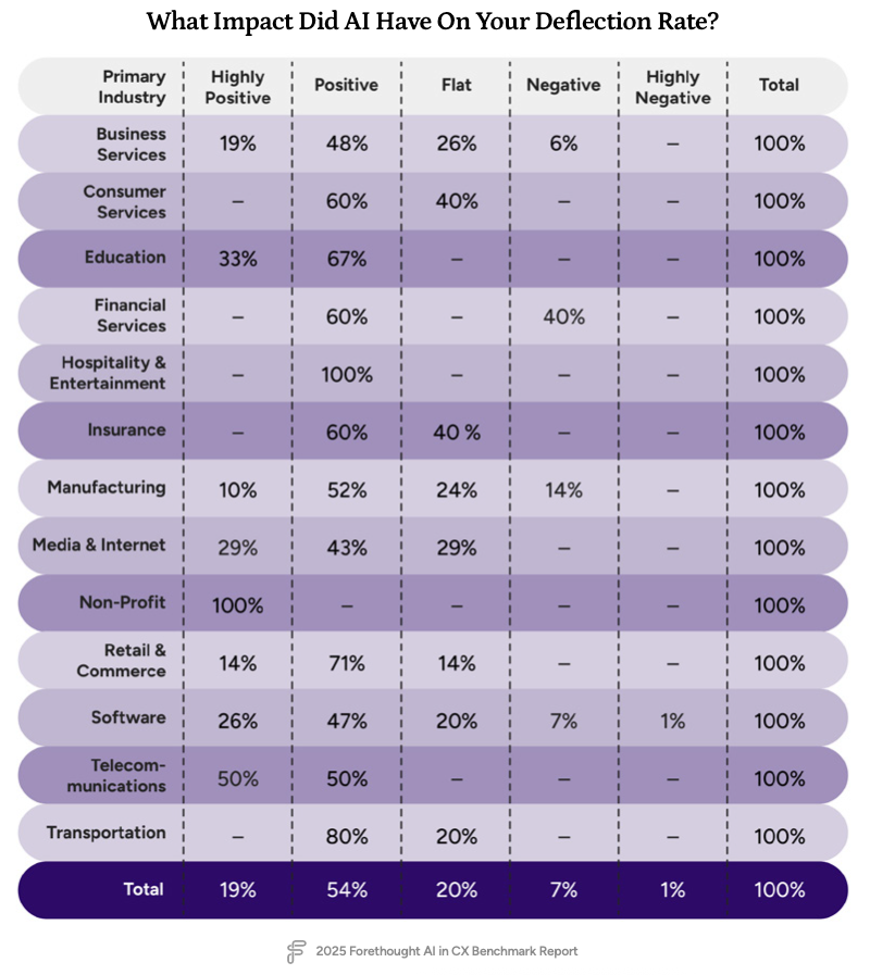 As the chart shows, financial services isn’t alone. Across industries like education, retail, and telecom, the majority of teams using AI reported a positive or highly positive impact on deflection.